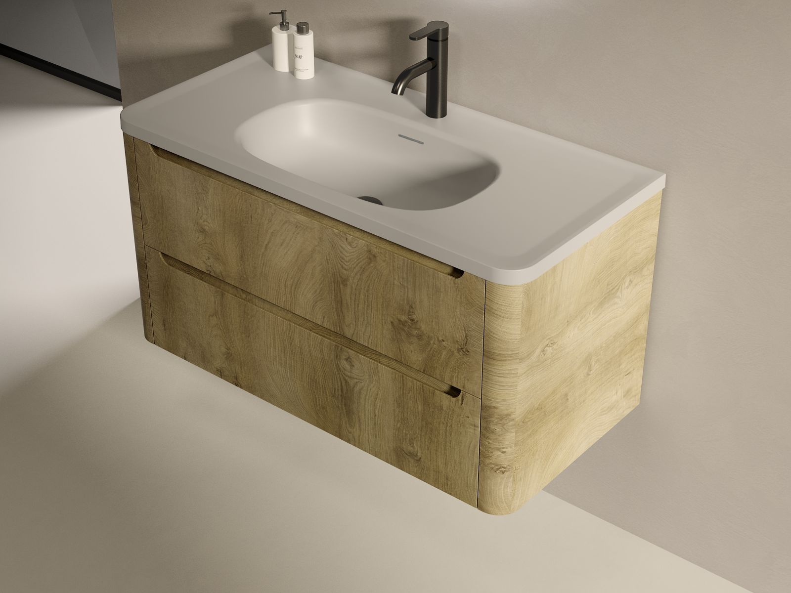 Élevez le style de votre salle de bain avec le meuble FLOW 1000 : un subtil équilibre entre courbes douces, fonctionnalité et chaleur naturelle. Son design suspendu aux coins arrondis casse les codes anguleux classiques et instaure immédiatement une ambiance apaisante et sophistiquée.