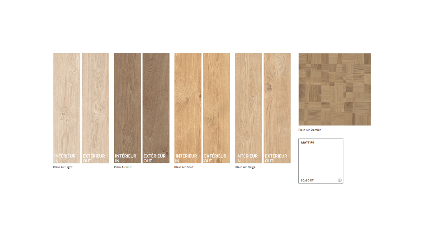 La série PLEIN AIR incarne la chaleur du bois dans une version durable et sans compromis. Grâce à son effet bois ultra réaliste, nappé de nœuds et de veines fidèlement reproduits, ce grès cérame met vos espaces en relation directe avec la nature, tout en offrant la robustesse du céramique.