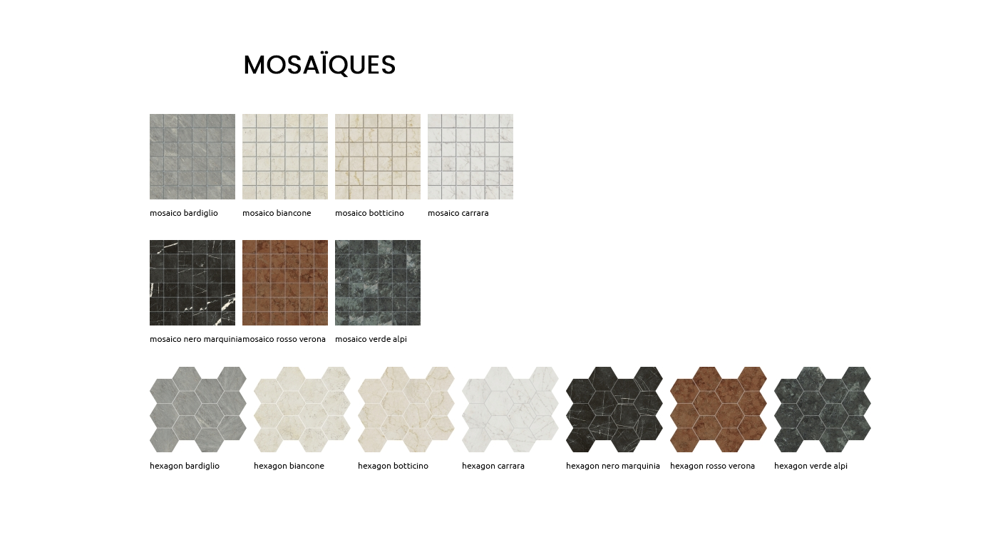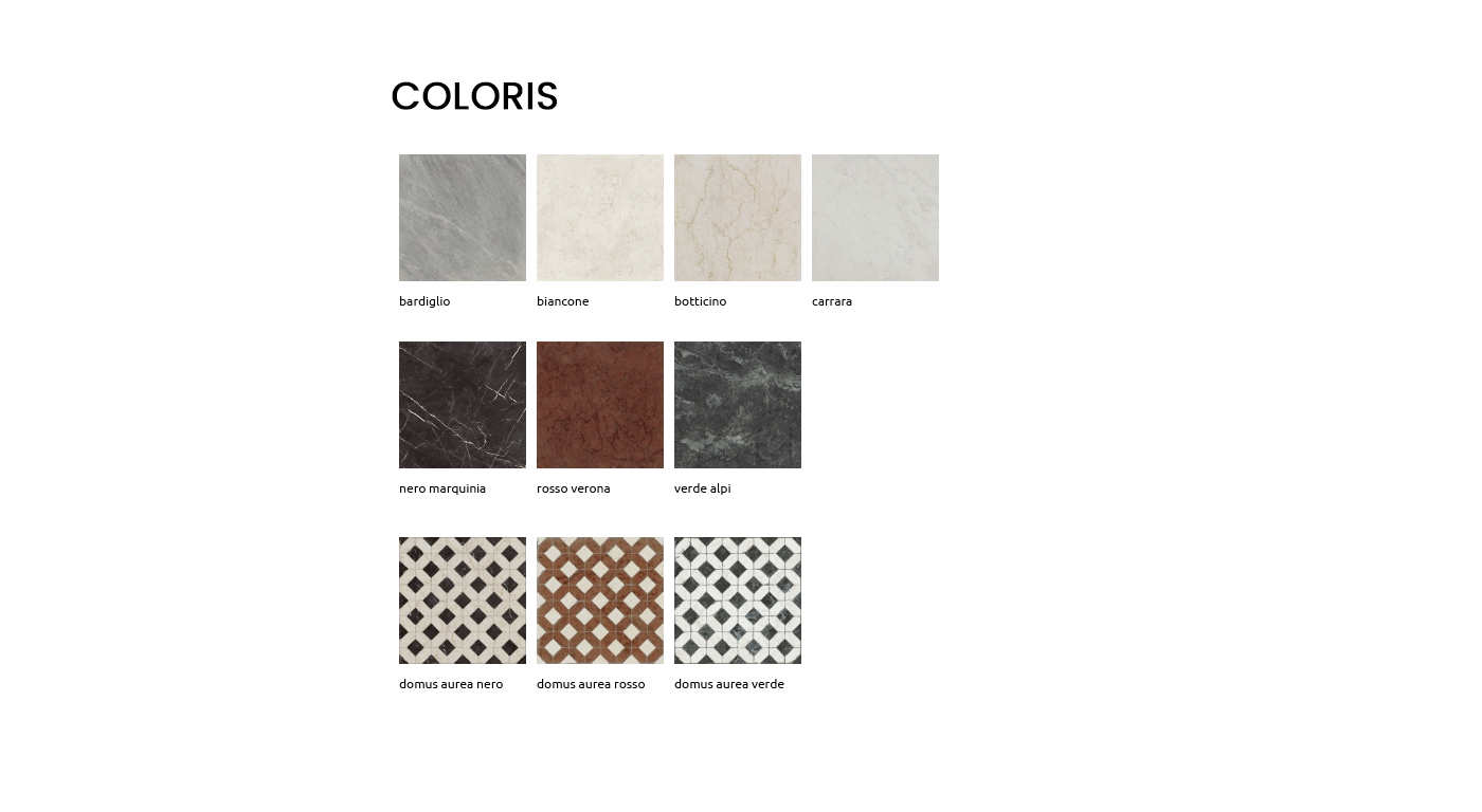 COLORIS : bardiglio • biancone • botticino • carrara • nero marquinia • rosso verona • verdi alpi