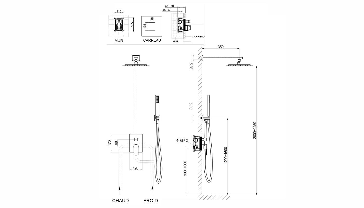 Hauteur douche supérieure - sol : 2000 à 2250mm