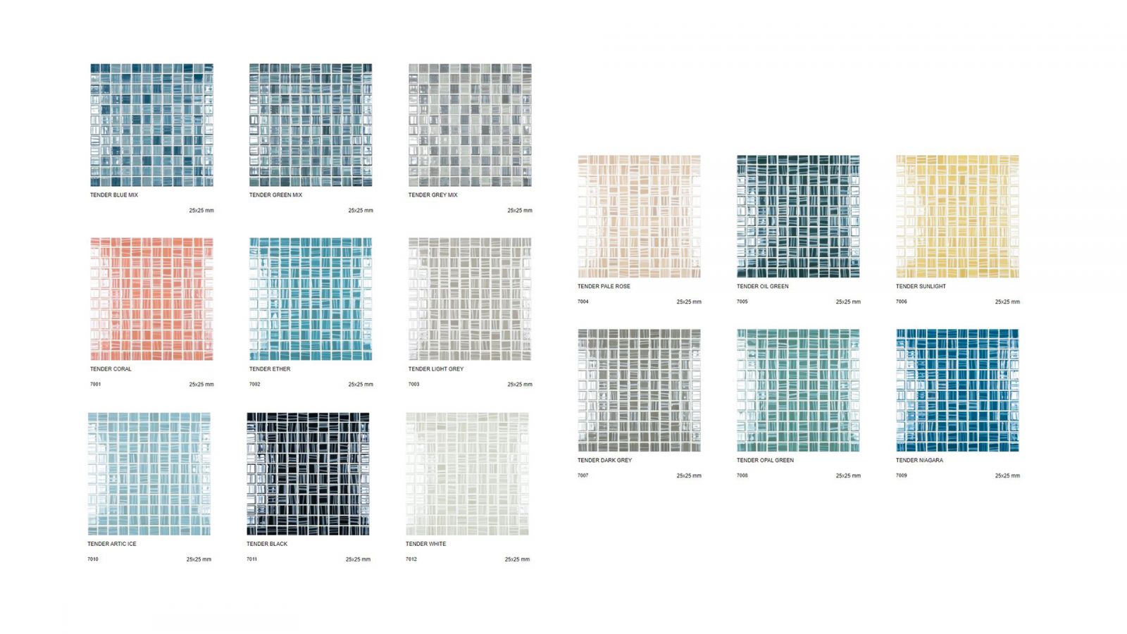 Découvrez la collection de mosaïques de piscine Tender. Disponible dans une grande palette de coloris, elle s'accordera aussi bien pour une piscine que des intérieurs. Pour une salle de bains ou encore une cuisine. Avec des jeux de formes et des reliefs crées par des couleurs associées sur une même pièce elles apporteront une touche d'originalité à tous les espaces. Disponible dans un format unique de 25x25 cm.