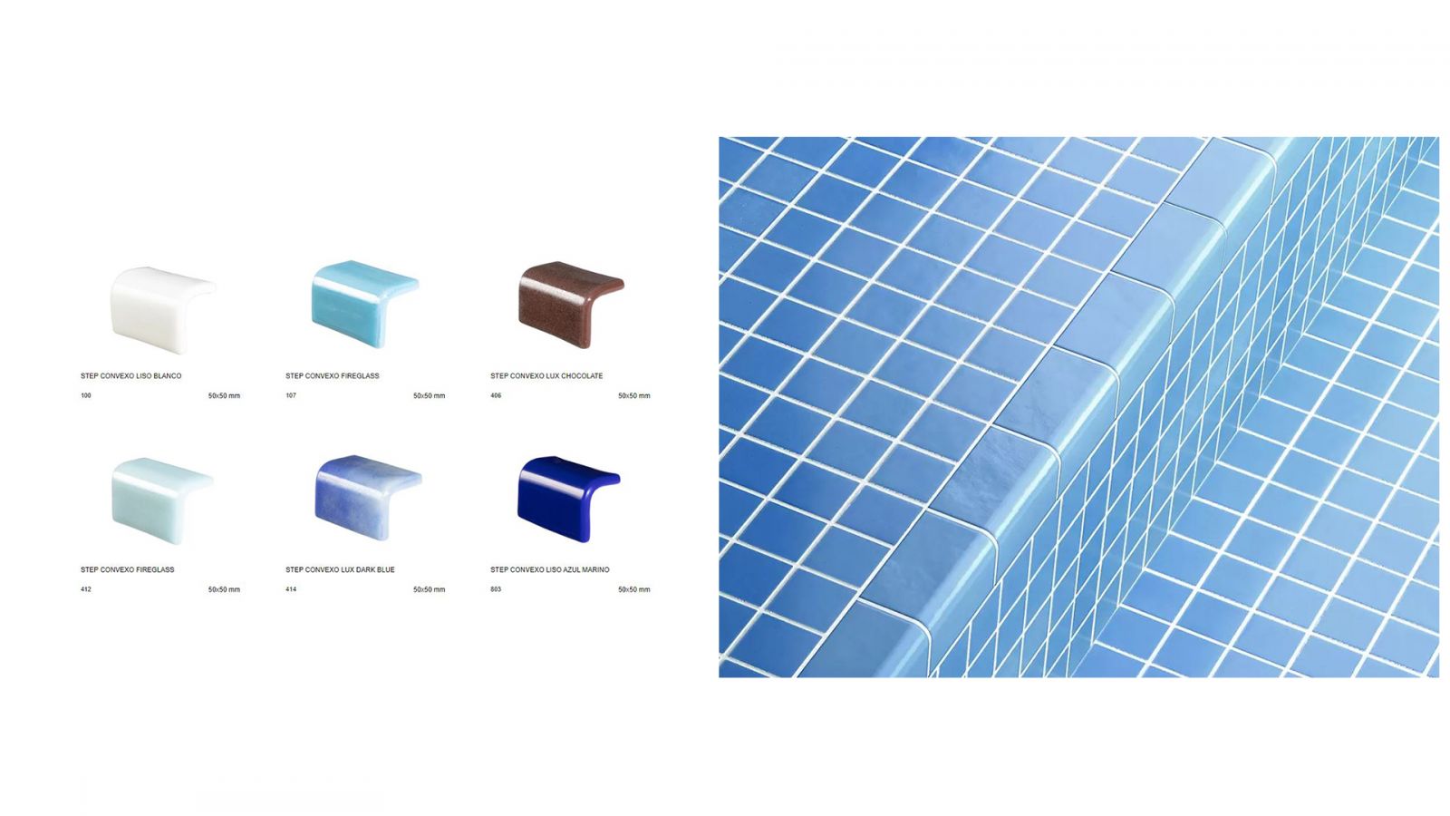Les mosaïques pour marches de piscines de la série Steps apportent un esthétisme arrondi aux bordures et vous apportent plus de sécurité. Elles sont disponibles dans différentes finitions et coloris chez Cerazur.